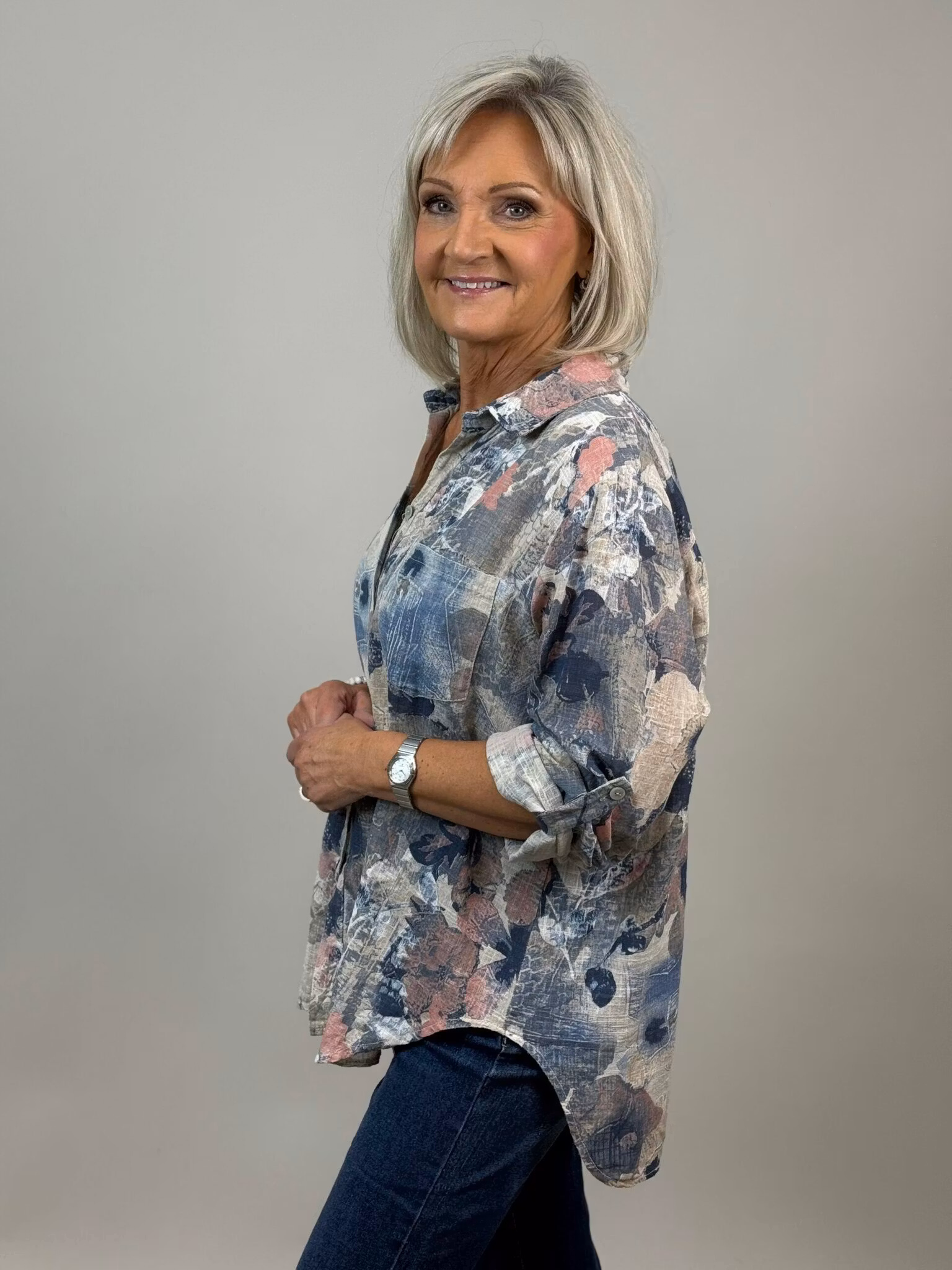 Kelly är en blommig blus med krage och knappar framtill och lång ärm med knappslå. Den har en bröstficka. Tillverkad i grovt vävd bomull som ger plagget en känsla av linne.