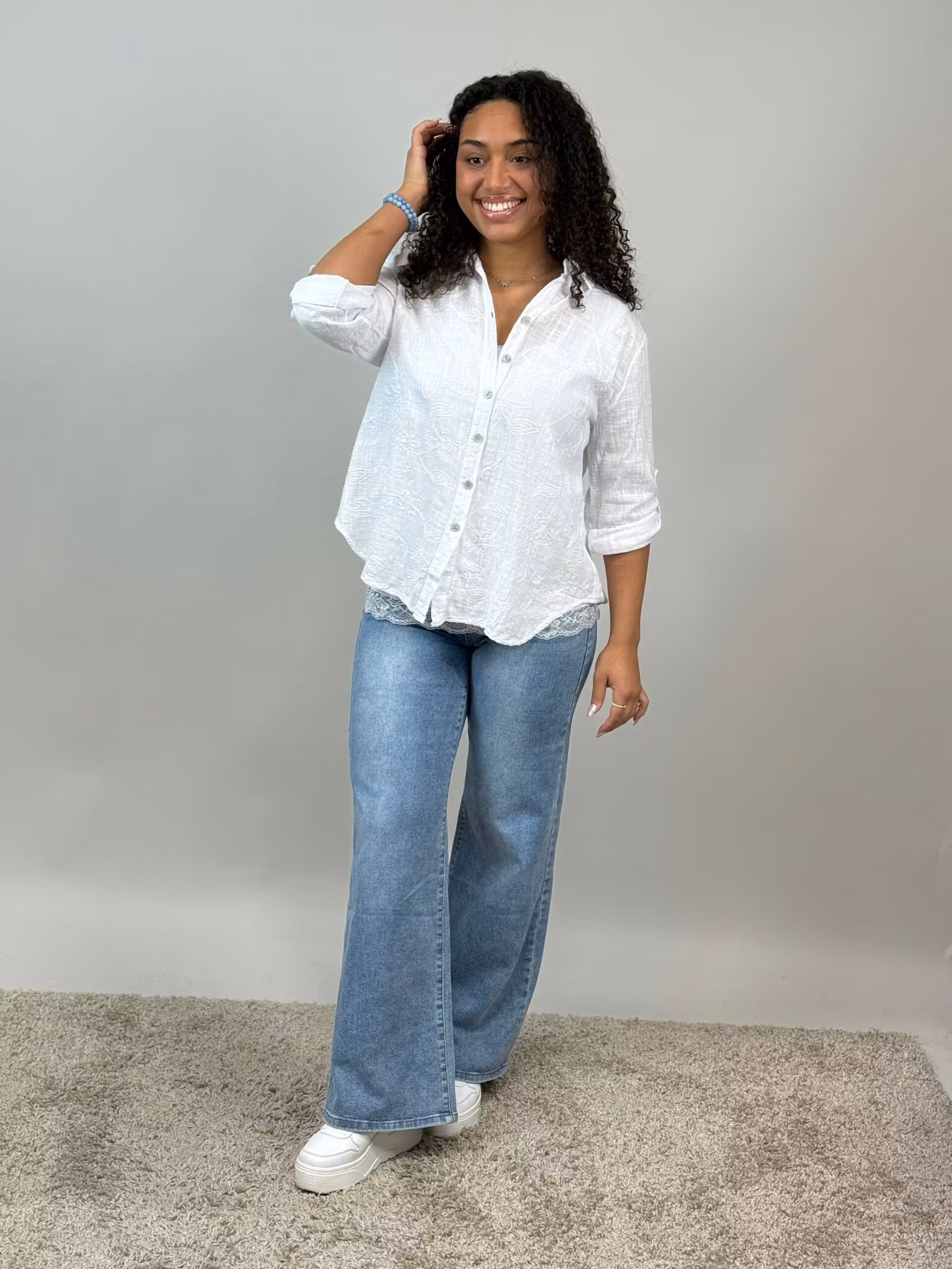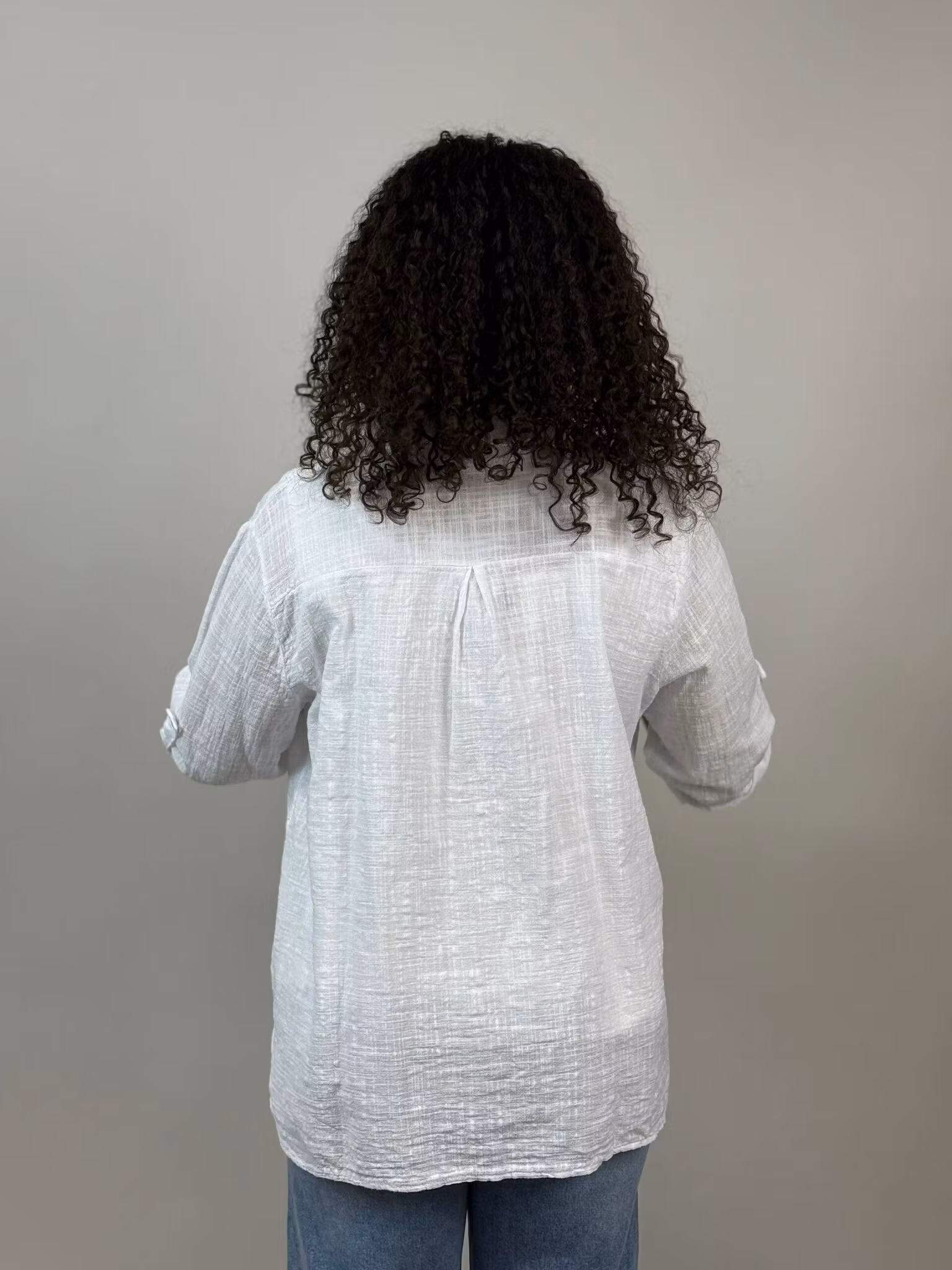 Fina blusen Kelly med brodyr på framsidan. Den har krage och knappar framtill och lång ärm med knappslå. Tillverkad i grovt vävd bomull som ger plagget en känsla av linne.