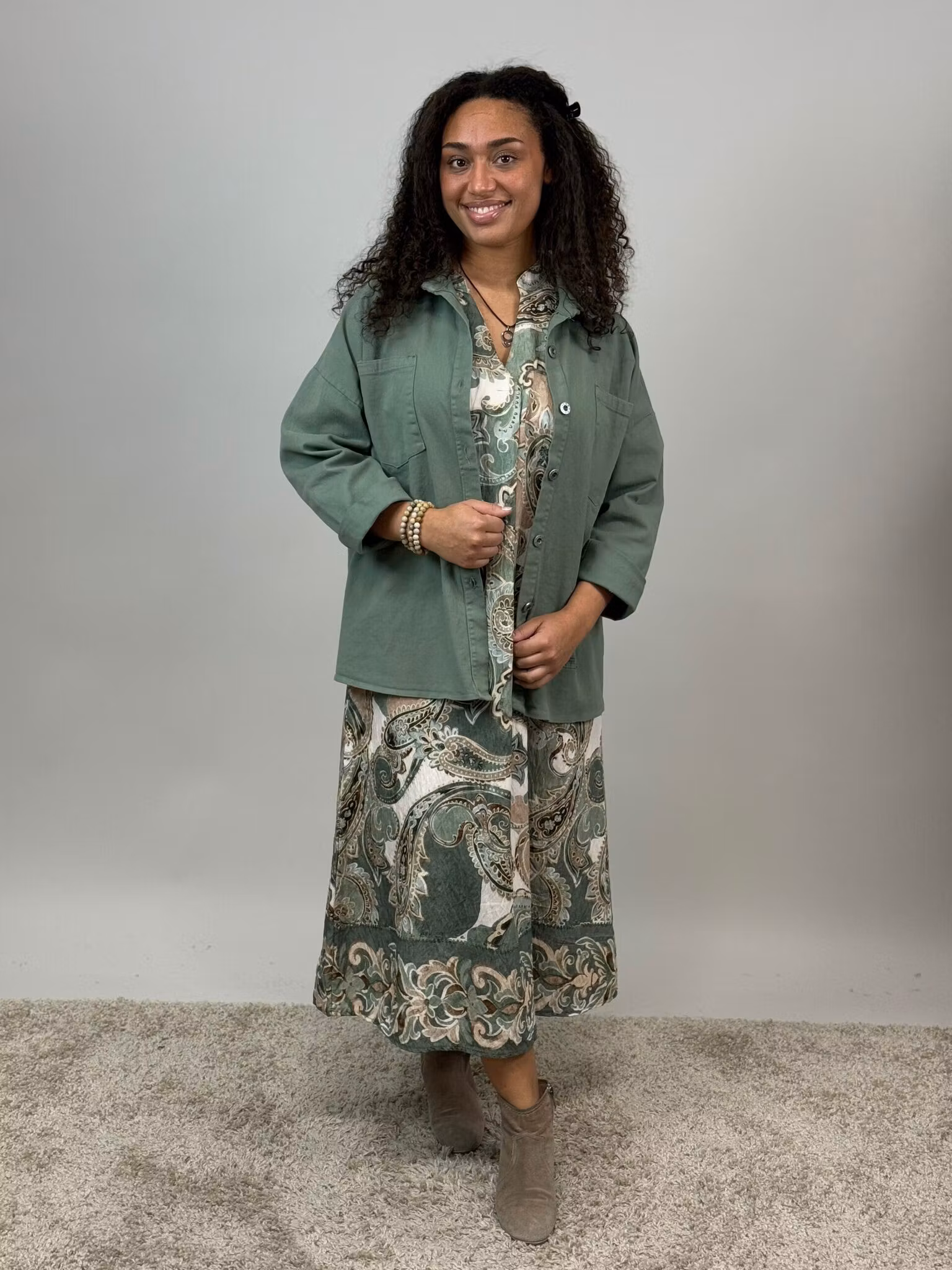 Snygg paisleymönstrad klänning i gröna toner. Den har ett motveck framtill och fickor i sidorna.
