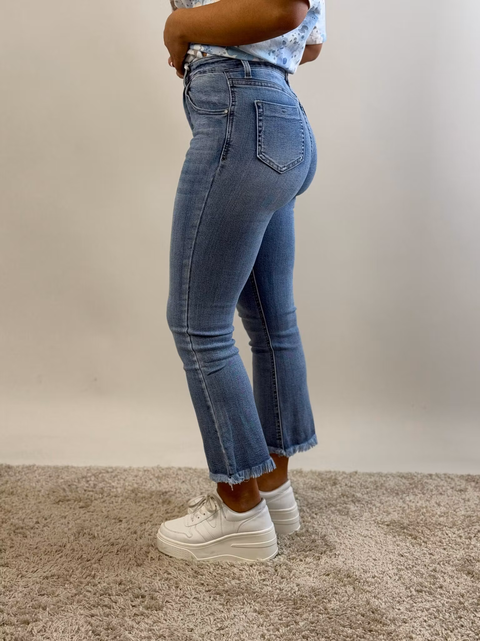 Stretchiga jeans i ankelmodell med fransad kant och fickor fram & bak.