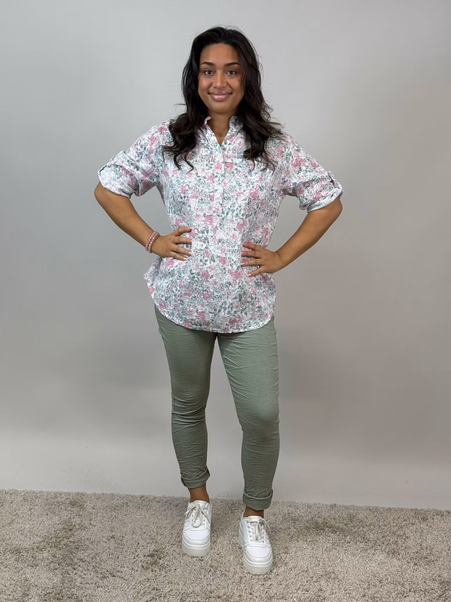 Fin småblommig blus med ståkrage i lös modell med 3 knappar och knappslå på ärmen. Blusen har en bröstficka. Tillverkad i grovt vävd bomull som ger plagget en känsla av linne.