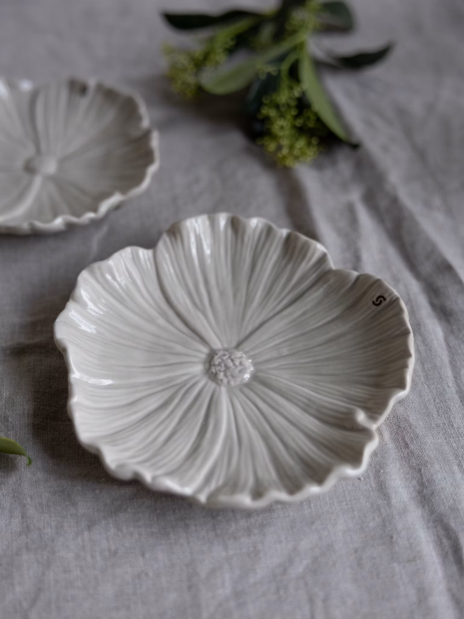 Keramikfat i form av en blomma. Detta vackra fat är både dekorativt och funktionellt, och passar perfekt för smycken, snacks eller bara som en iögonfallande dekoration.
