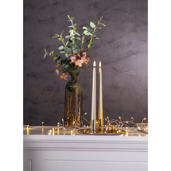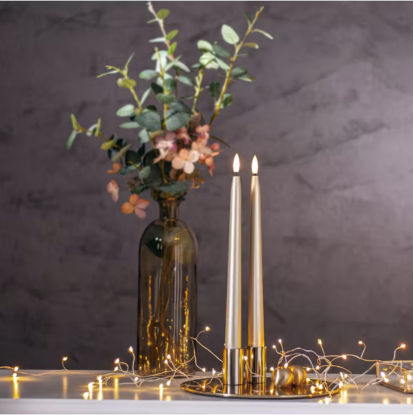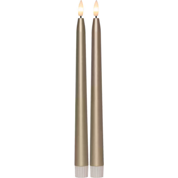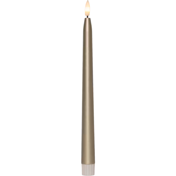 Flamme Metal antikljus är ett batteriljus i guldskimrande ton. Den lyser med varmvitt sken och har den realistiska lågan Flamme. Inbyggd timer - 6h på, 18h av, repeterande.
