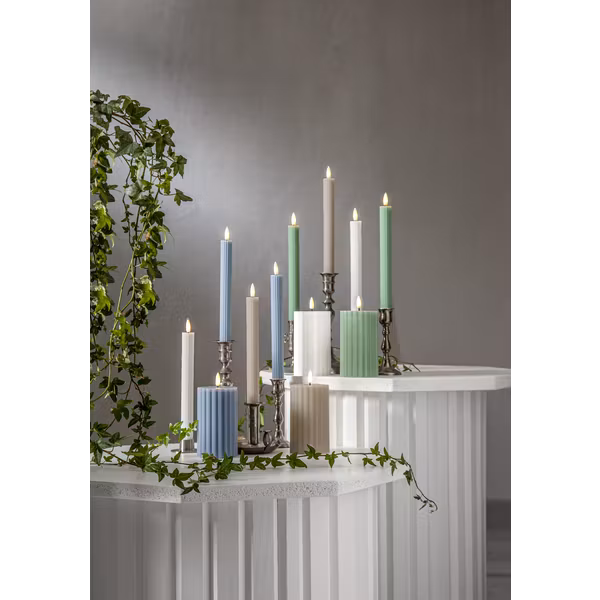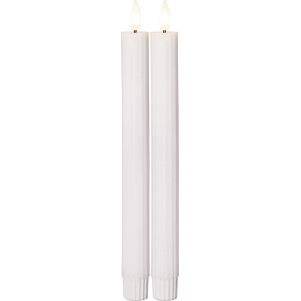 Flamme Stripe 2-pack är ett antikljus gjord av vitt vax med en räfflad-randig yta. Detta elektriska ljus blir en vacker dekoration, både ensam och i grupp.