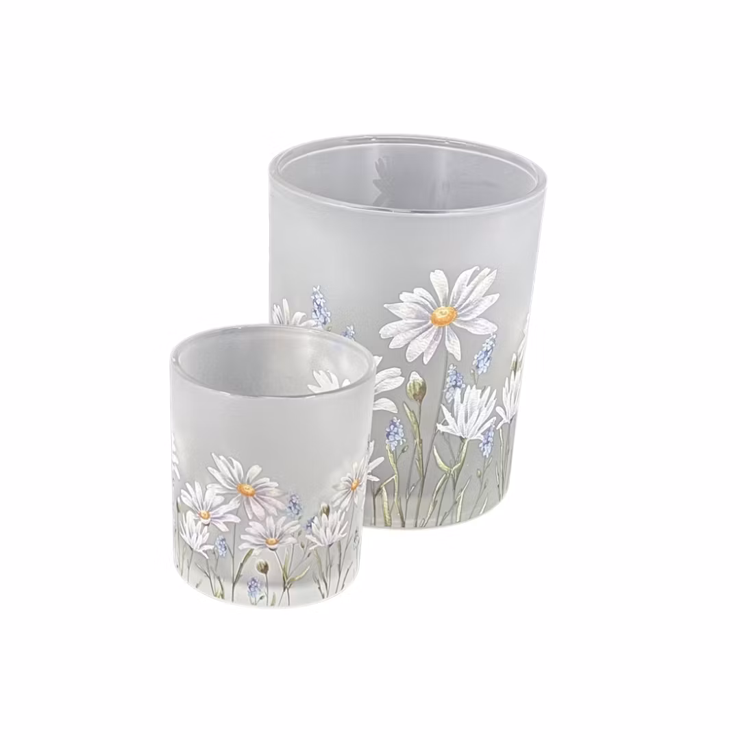 Vacker ljuslykta med prästkragar och blå blomster. Ger ett vackert sken. Finns i 2 storlekar.