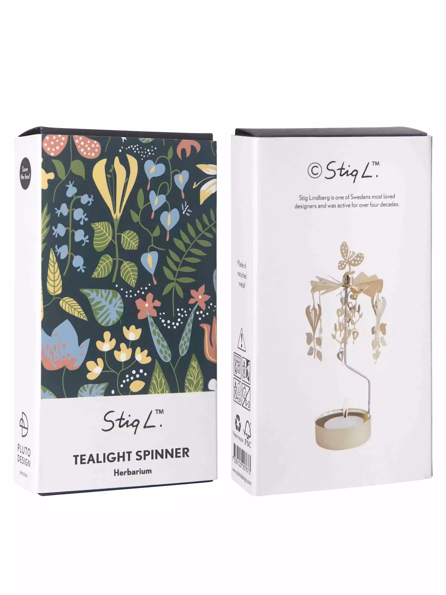 Låt detta eleganta änglaspel i guldfärgad metall sprida värme i ditt hem. Med Stig Lindbergs klassiska mönster Herbarium blir det en tidlös inredningsdetalj som är lika vacker året om. Ett värmeljus medföljer i förpackningen.