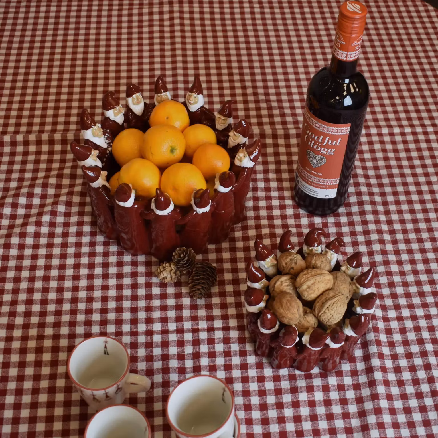 En vacker skål med 14 st tomtar ring, alla tomtarna med olika ansiktsuttryck. Servera frukt, nötter eller godis i denna skål i juletid.