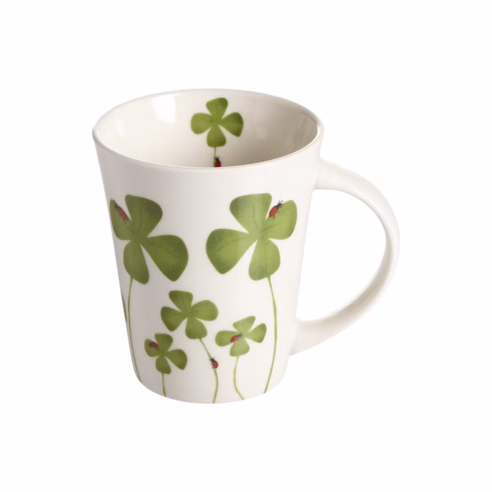 Mugg med motiv av klöver & nyckelpigor på utsidan och även i muggen.
