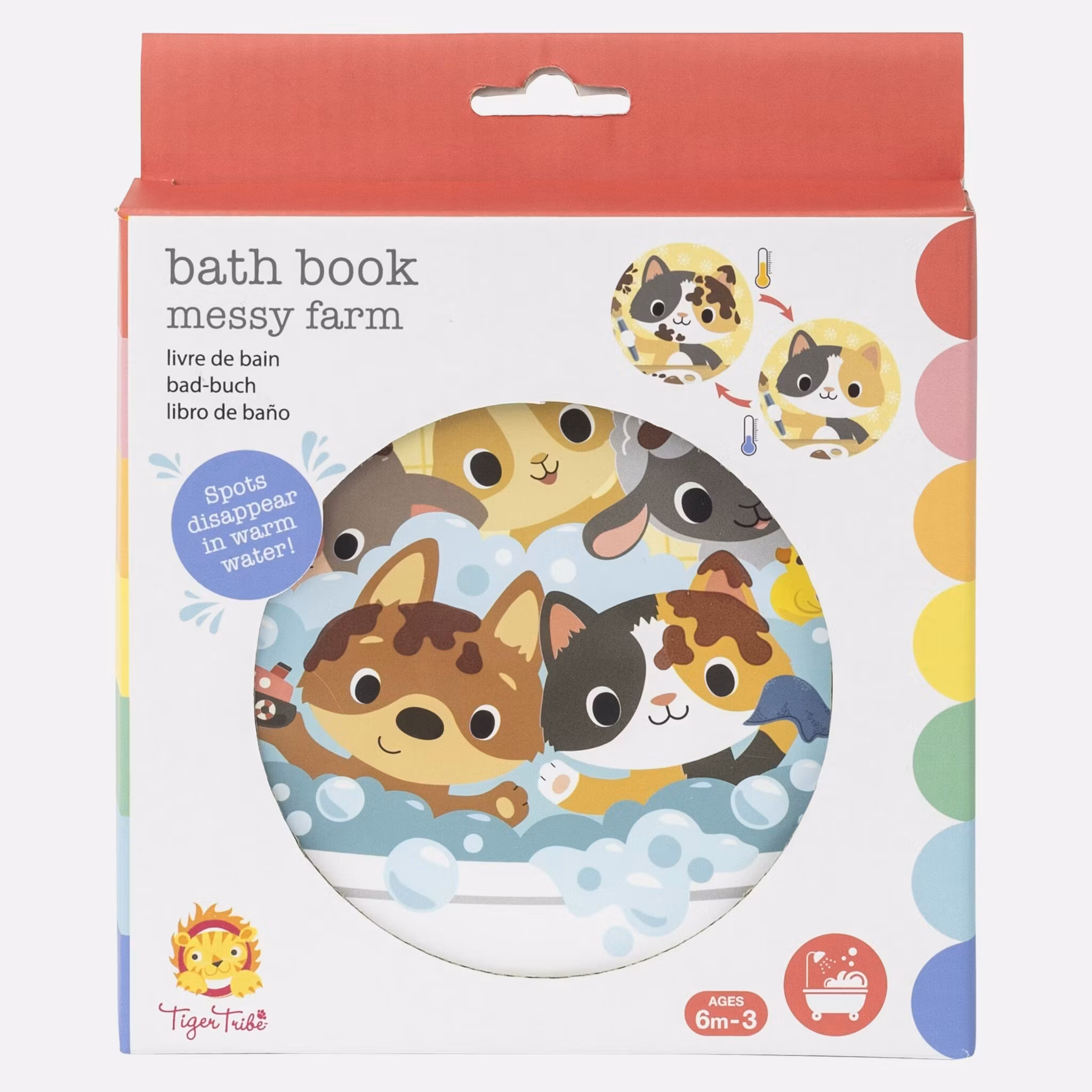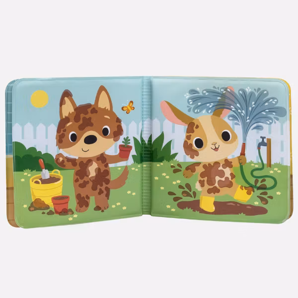 En bok att ta med sig i badet. Djuren är lite smutsiga och behöver bada. När de får varmt vatten på sig försvinner smutsen. Blir vattnet kallt kommer smutsen tillbaka. En rolig leksak i badet!