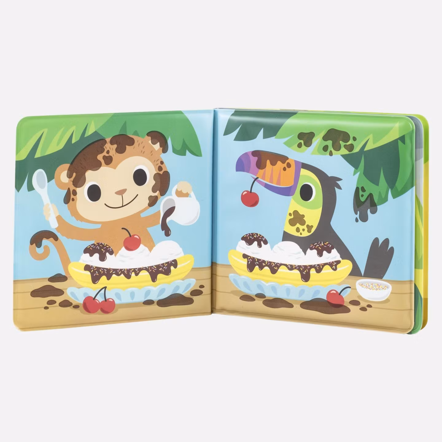 En bok att ta med sig i badet. Djungeldjuren är lite smutsiga och behöver bada. När de får varmt vatten på sig försvinner smutsen. Blir vattnet kallt kommer smutsen tillbaka. En rolig leksak i badet!