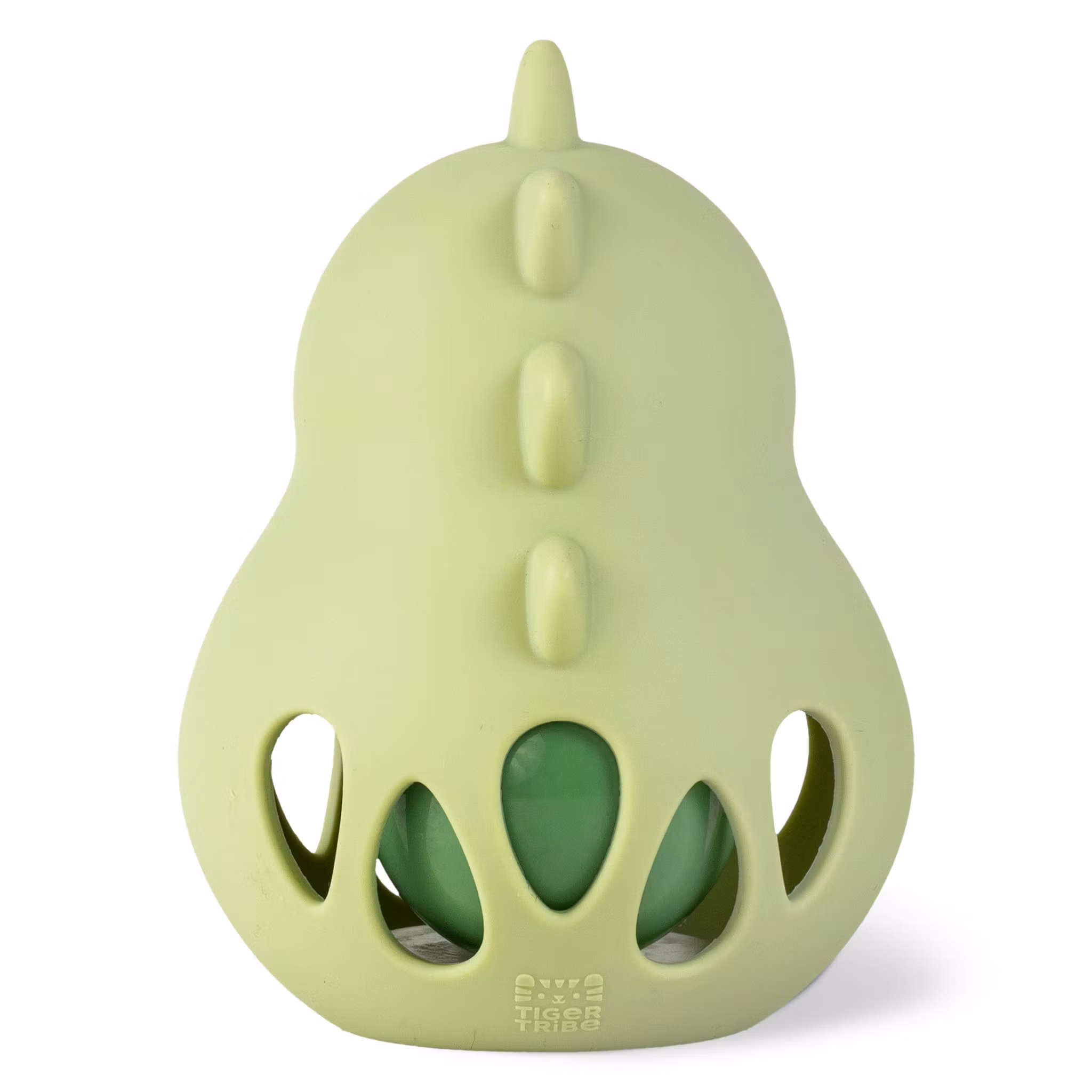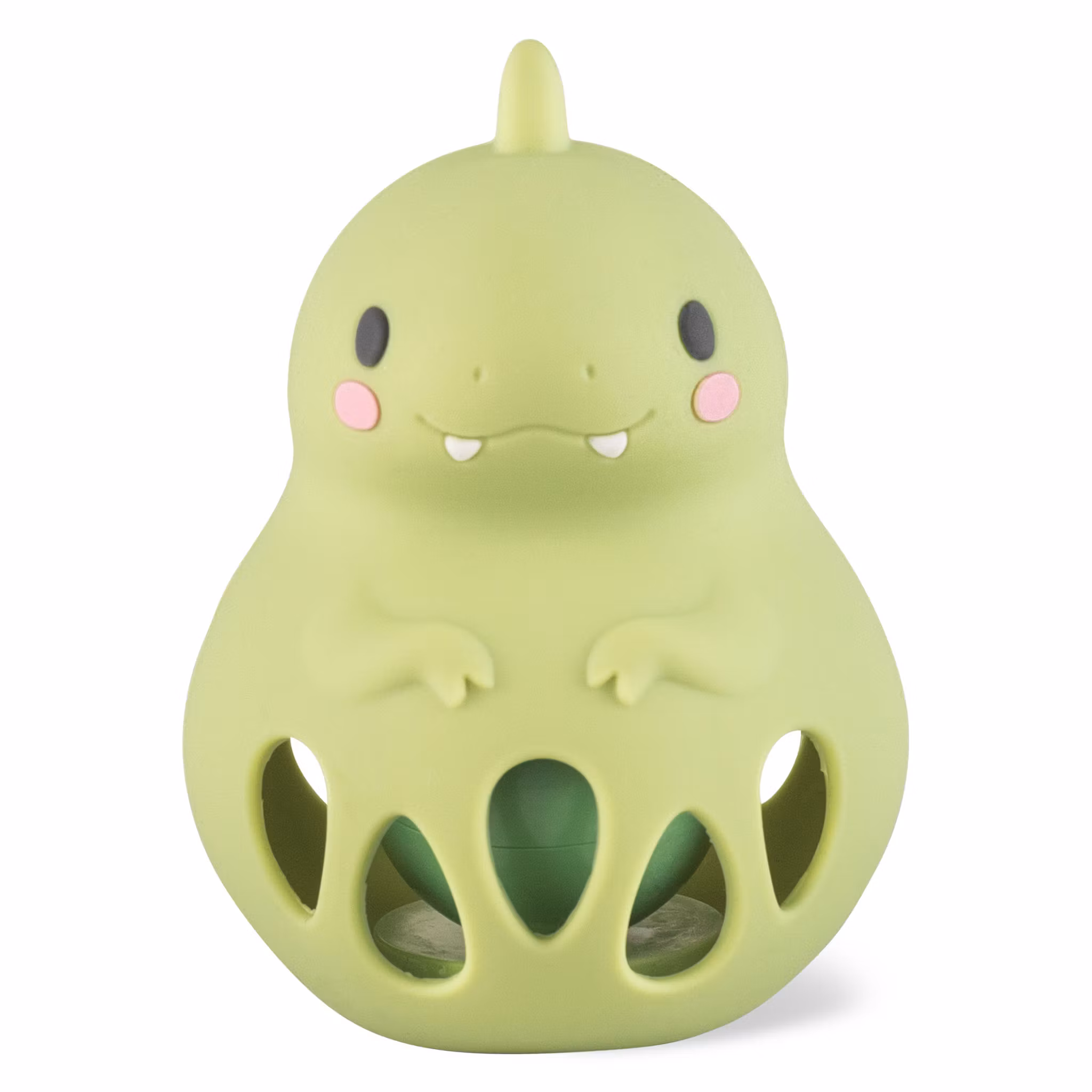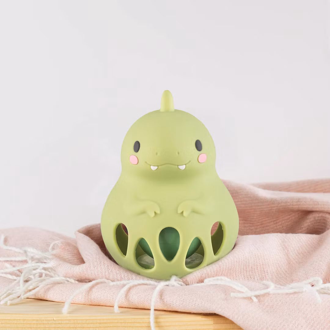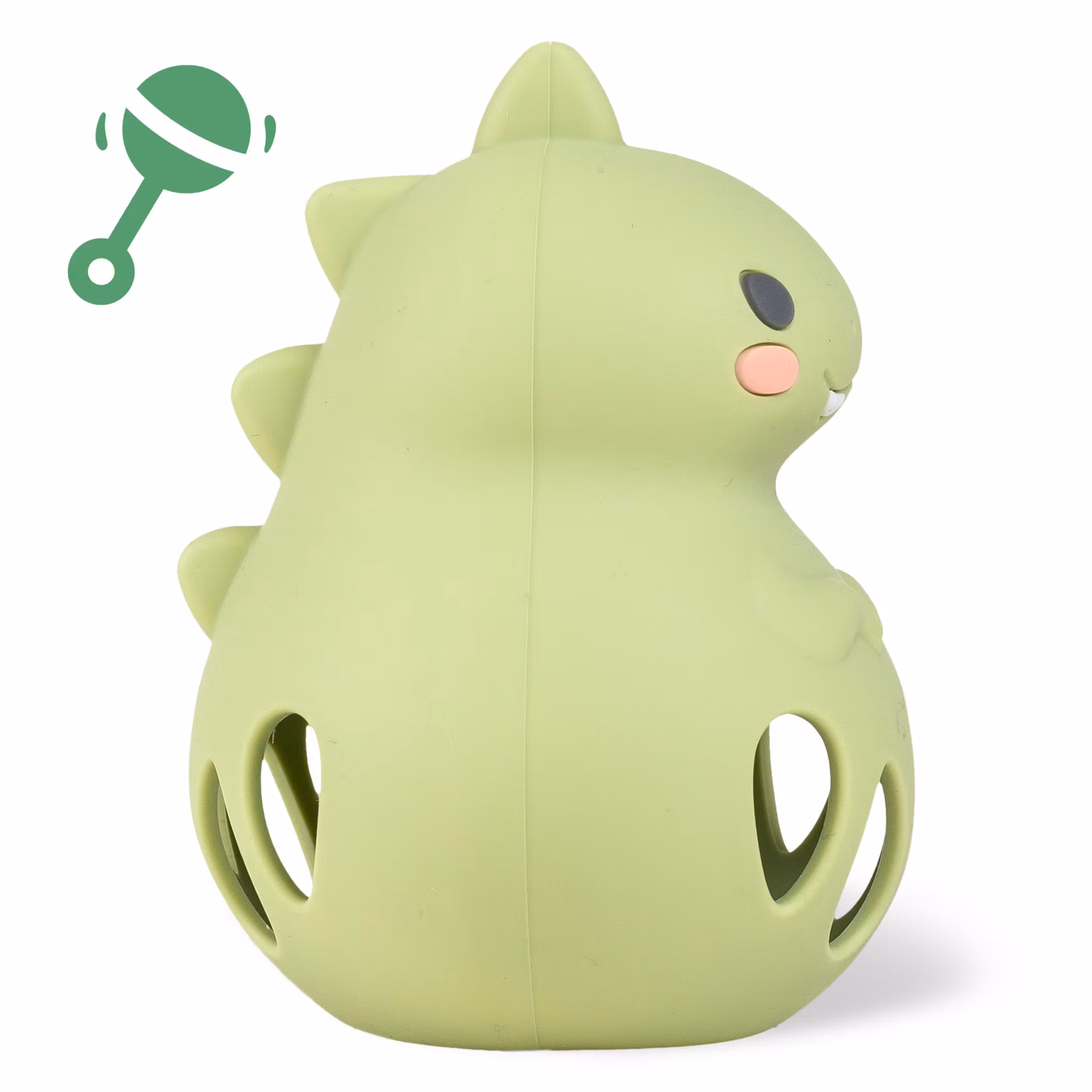 Denna söta skallra kommer att bli ditt barns ständiga följeslagare och kommer garanterat att bli en omedelbar favorit. Den är tillverkad av mjukt, säkert silikon som är lätt för små händer att greppa och hålla, så även de allra minsta kan få grepp om den söta dinosaurieformen. När barn skakar eller klämmer på den belönas de med ett mjukt klingande ljud från bollen inuti. Förbered dig på att ditt barns lilla ansikte lyser upp av glädje när de får tag i denna söta och mjuka lilla dinosaurie.