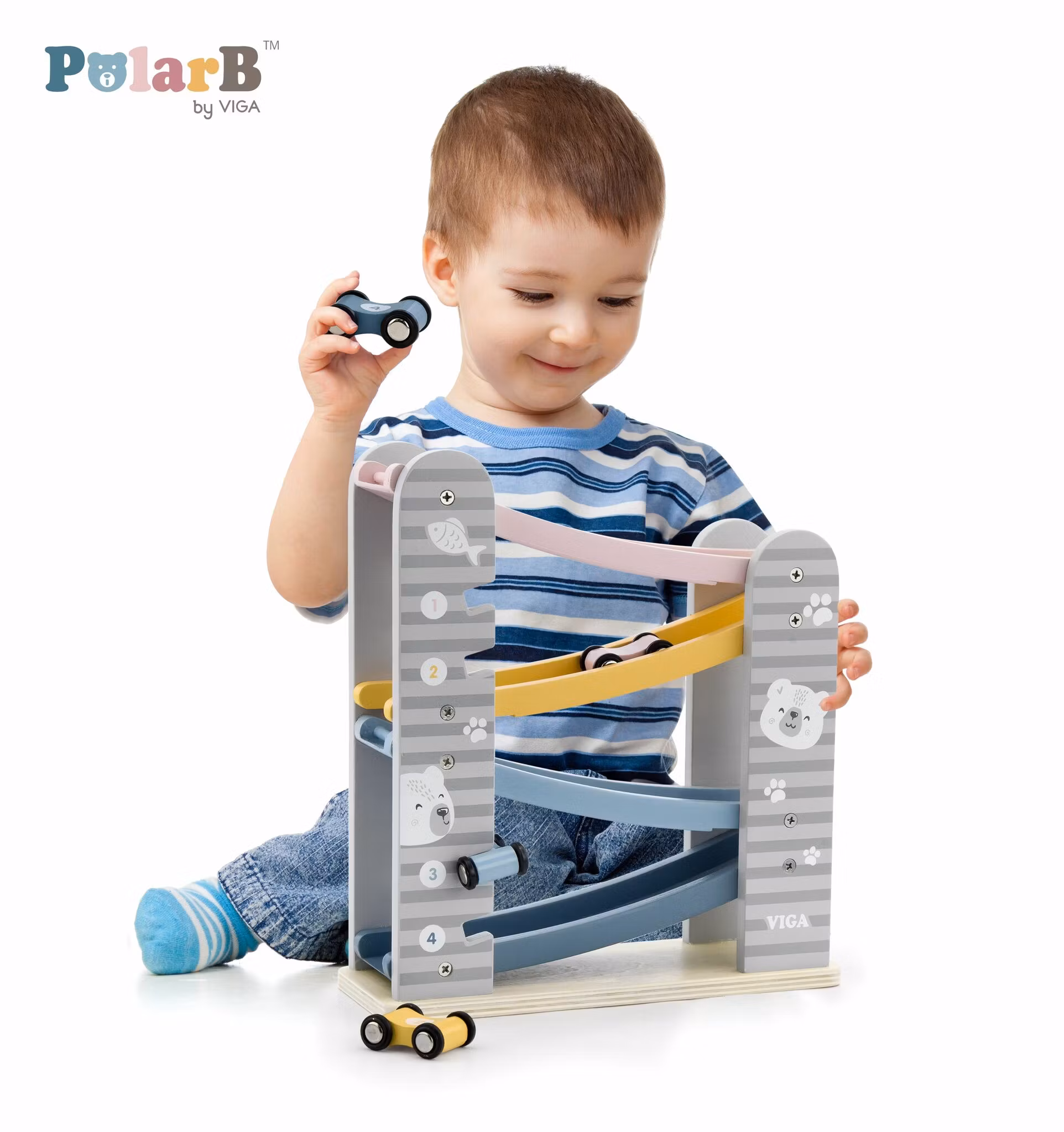 Det här är en rolig bilbana i trä med medföljande racerbilar som åker hela vägen ner för banan när man släpper dem från toppen.
