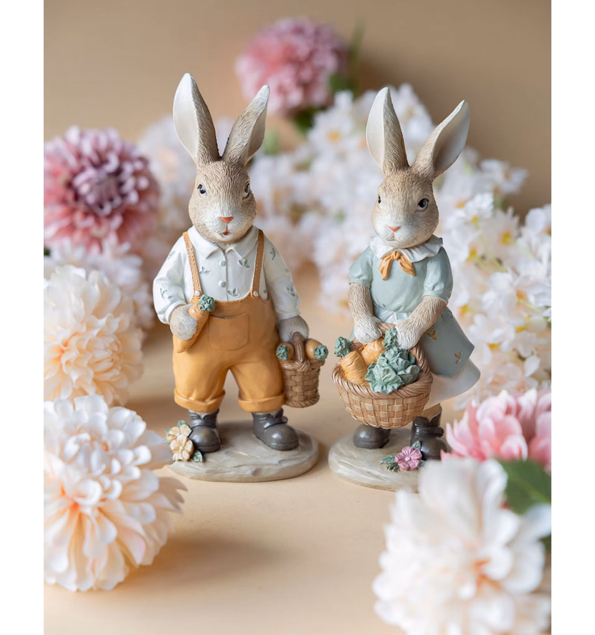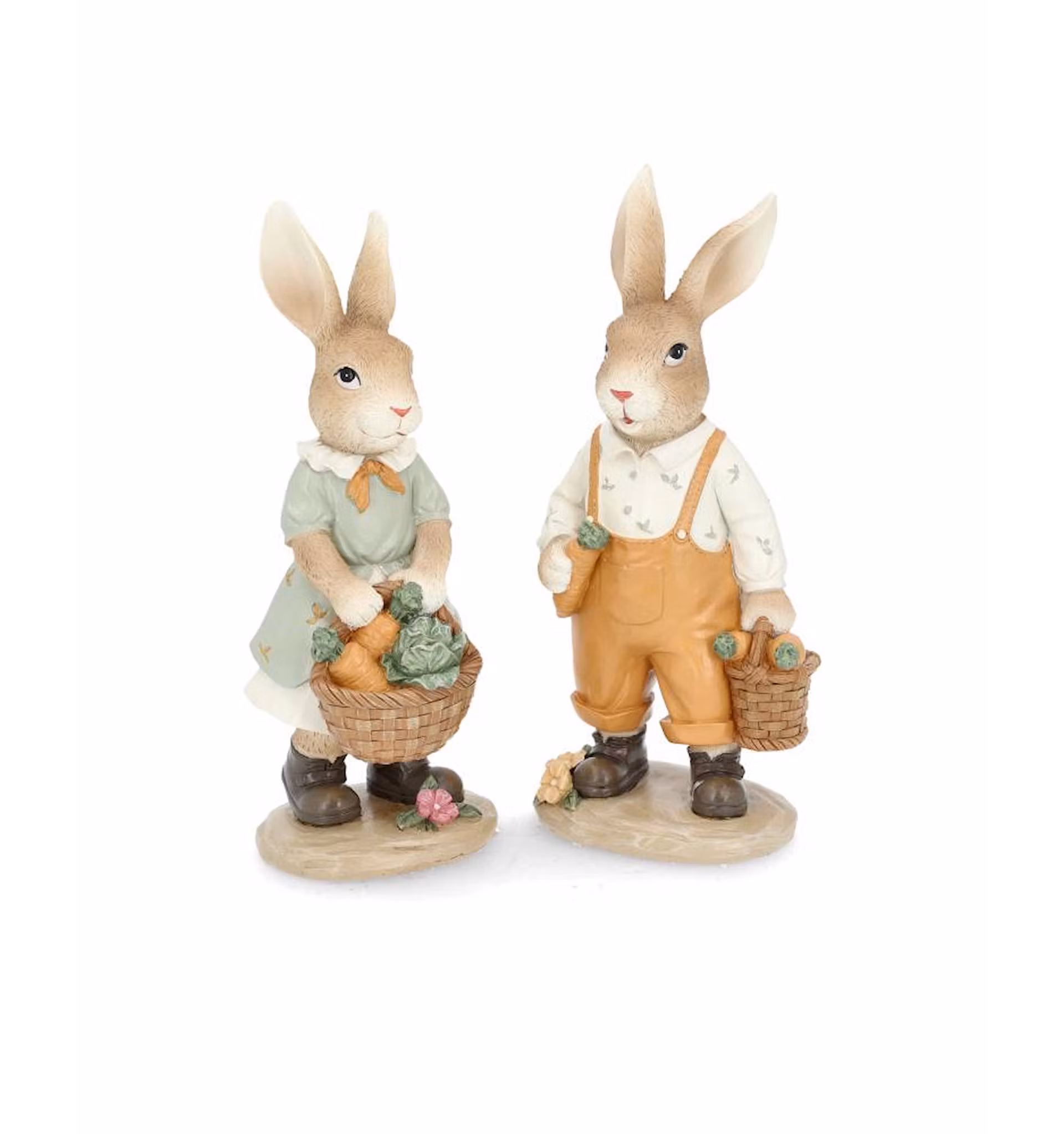 Sött kaninpar som håller en korg med grönsaker. Perfekt som dekoration i fönstret eller på soffbordet.