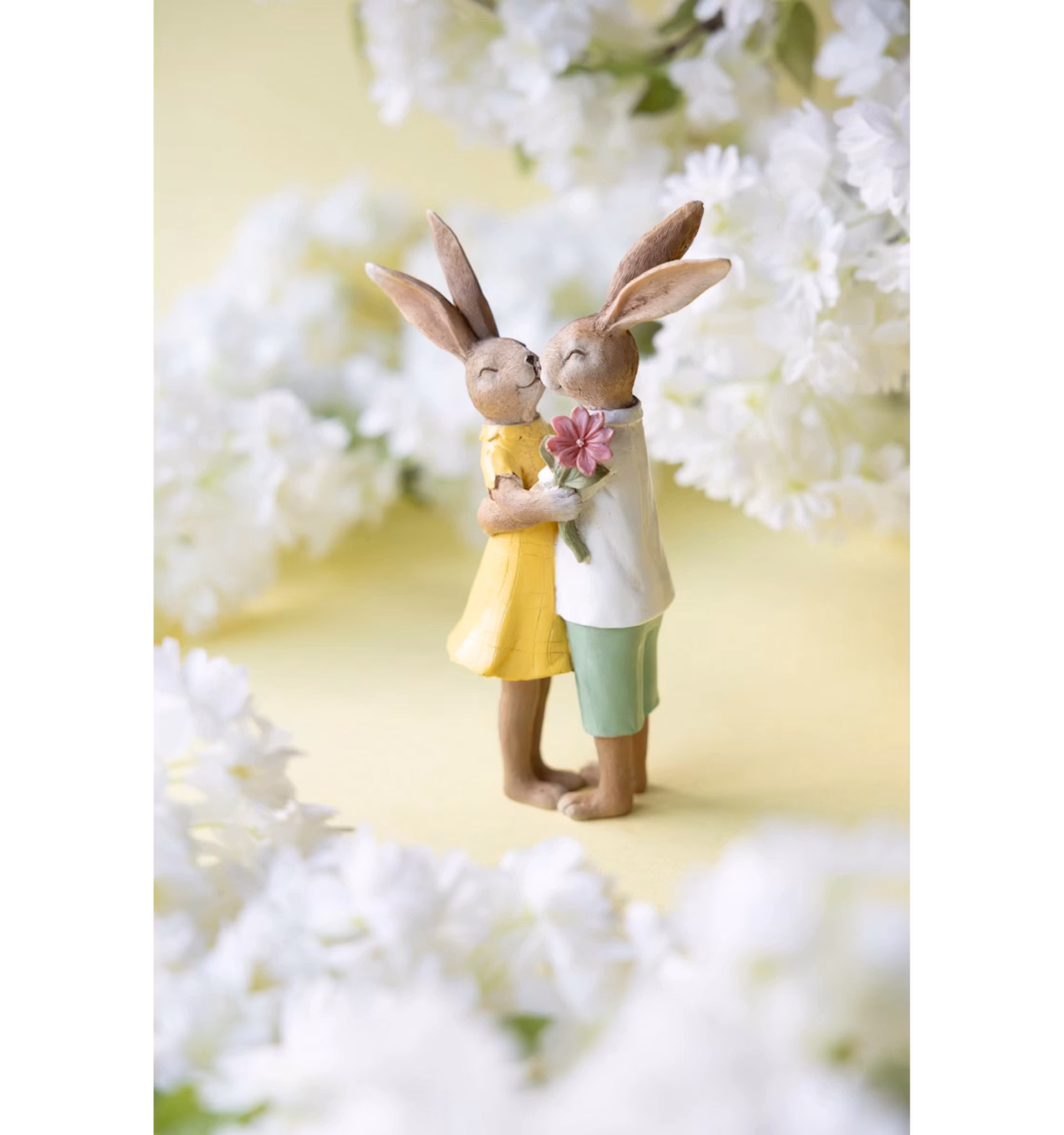 Sött kaninpar som kramas, pussas och håller en blomma. Perfekt som dekoration i fönstret eller på soffbordet.