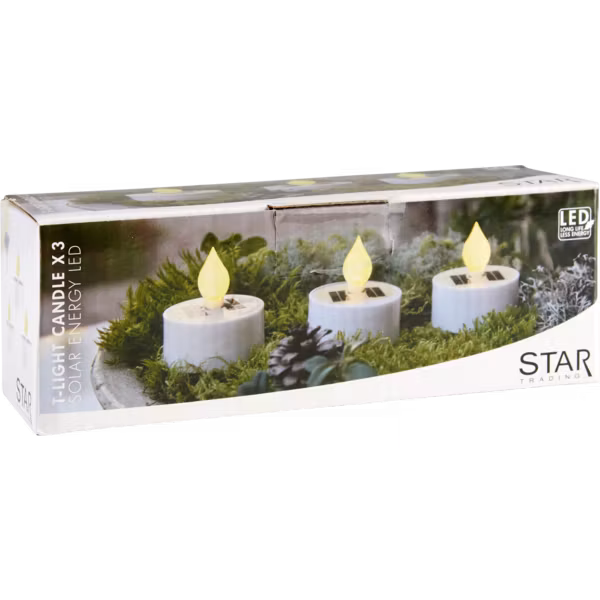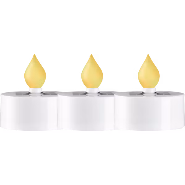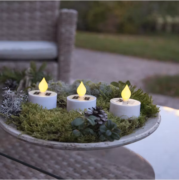 Solcellsljusen Saul är ett 3-pack vita värmeljus som drivs av solenergi. Placeras fint utomhus på ett bord för att skapa en mysig stämning med ljus.