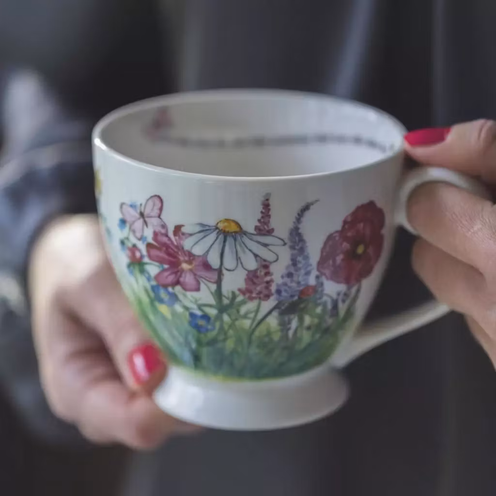 Stor och rymlig tekopp med ett härligt blomstermönster på utsidan och texten "Du ska inte tro det blir sommar ifall inte nån sätter fart" på insidan. En perfekt present att ge bort.