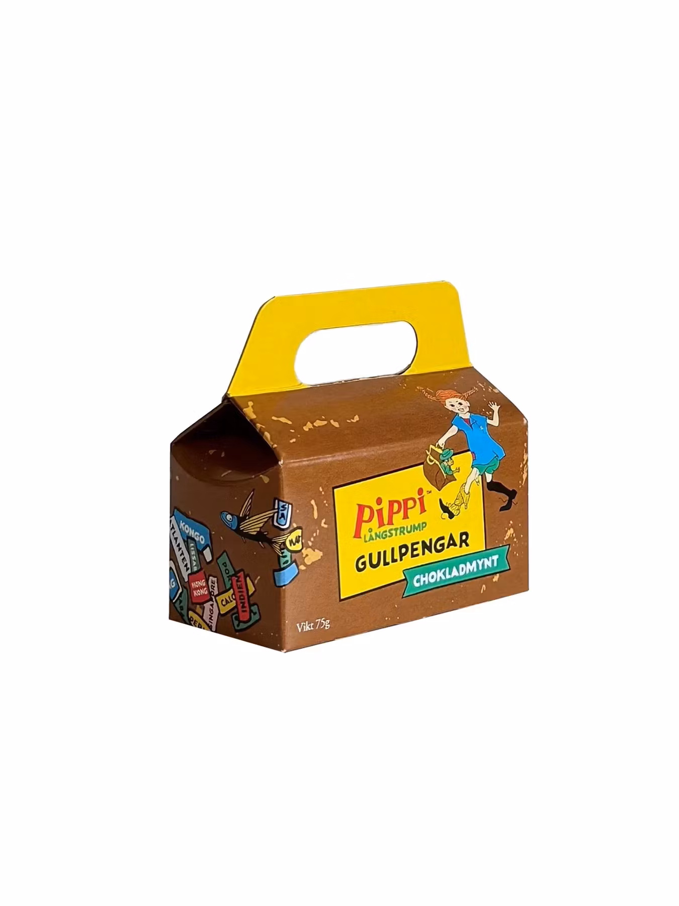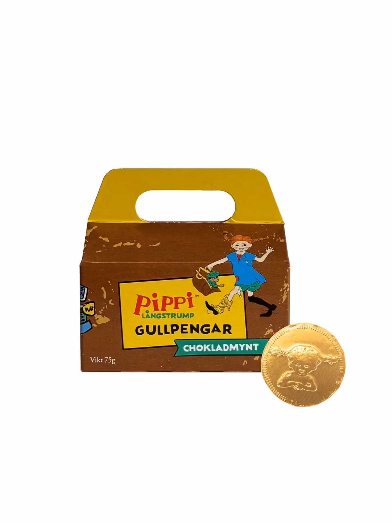 Pippi Långstrumps kappsäck med 14 stycken chokladmynt. Perfekt för barnkalaset, skattjakt eller som present.