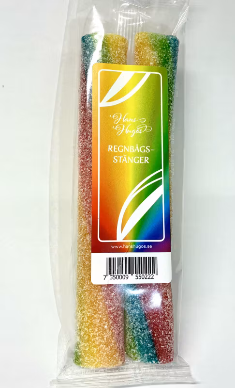 Ingredienser: socker, glukos-fruktossirap, VETEMJÖL, stärkelse, syra (äppelsyra), vegetabiliskt fett (palm), gelatin, surhetsreglerande medel (mjölksyra, citronsyra), aromer, surhetsreglerande medel (E325, E331), salt, emulgeringsmedel (E471), fuktbevarande medel (glycerol), färgämne (E100, E120, E133, E163).