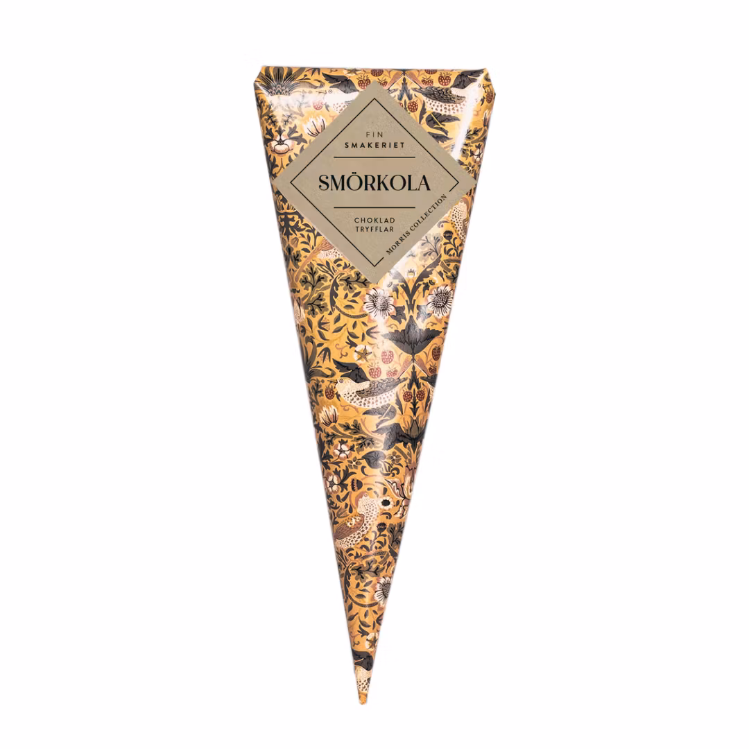 Finsmakeriet Chokladtryffel med smak av smörkola. Kommer i en fin dekorativ strut med William Morris motiv Strawberry Thief Gul!