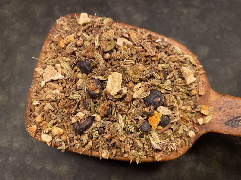 Innehåll: Enbär, angelikarot, kummin, fänkål, anis, koriander, pomerans.