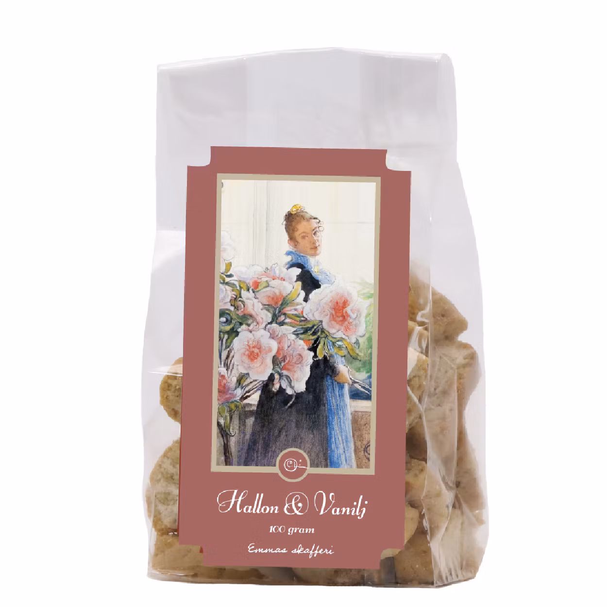 Handgjorda skorpor med härliga bitar av hallon och med lätt smak av vanilj. Förpackade i en vacker påse med Carl Larsson motiv.