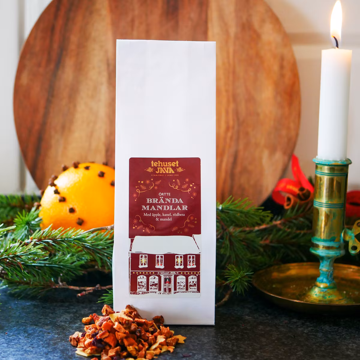 Brända Mandlar, ett fylligt örtte med smak av äpple, kanel, mandel och rödbeta. Blir rosa när man brygger teet.