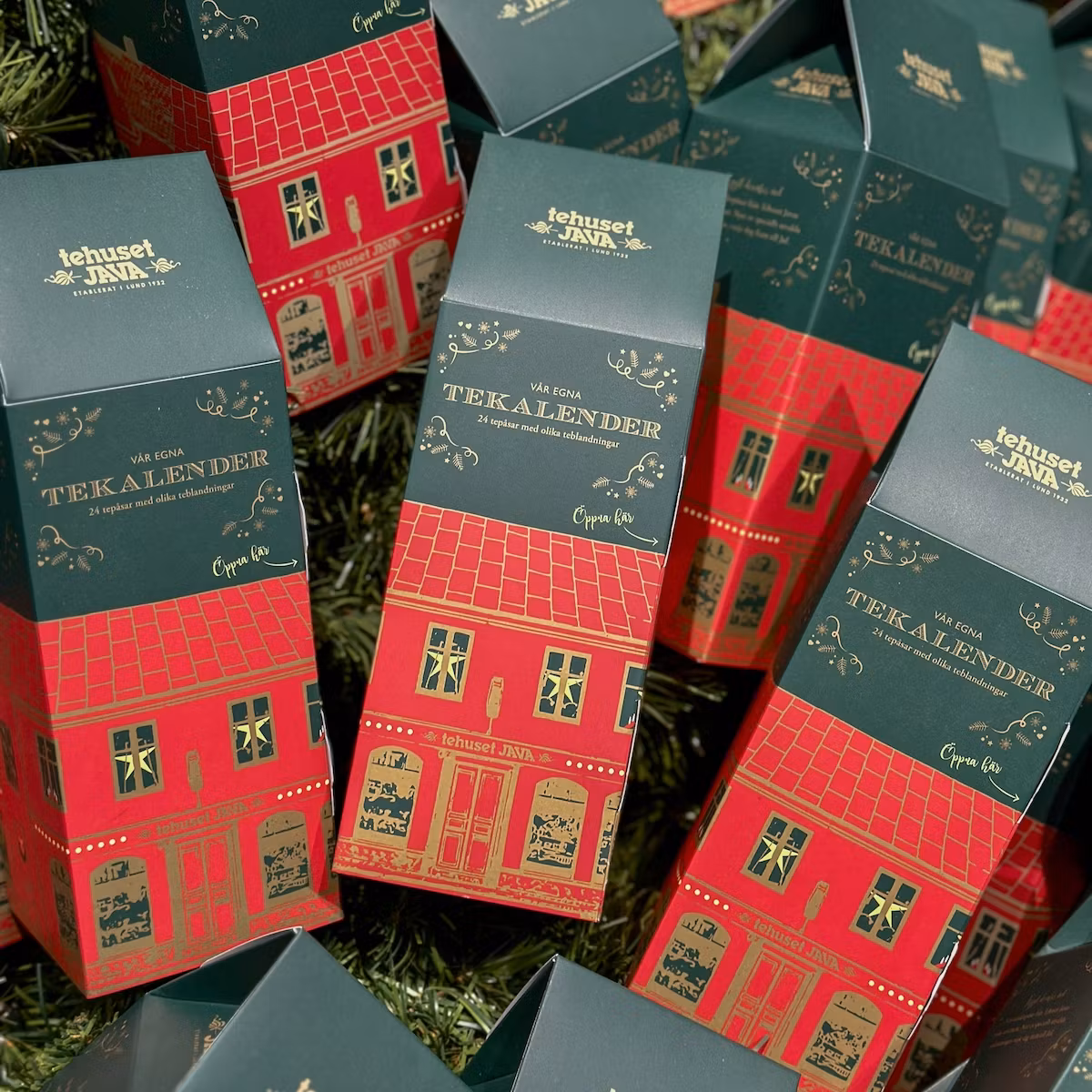 Tehuset Javas tekalender med 24 olika noga utvalda teer i komposterbara tepåsar.