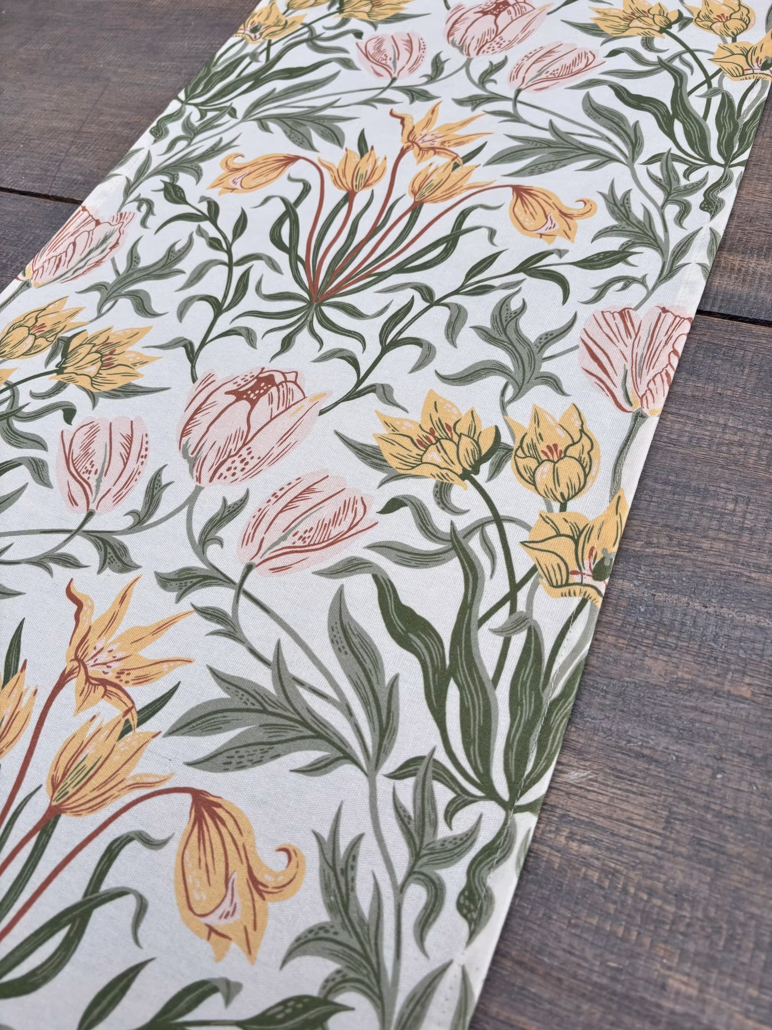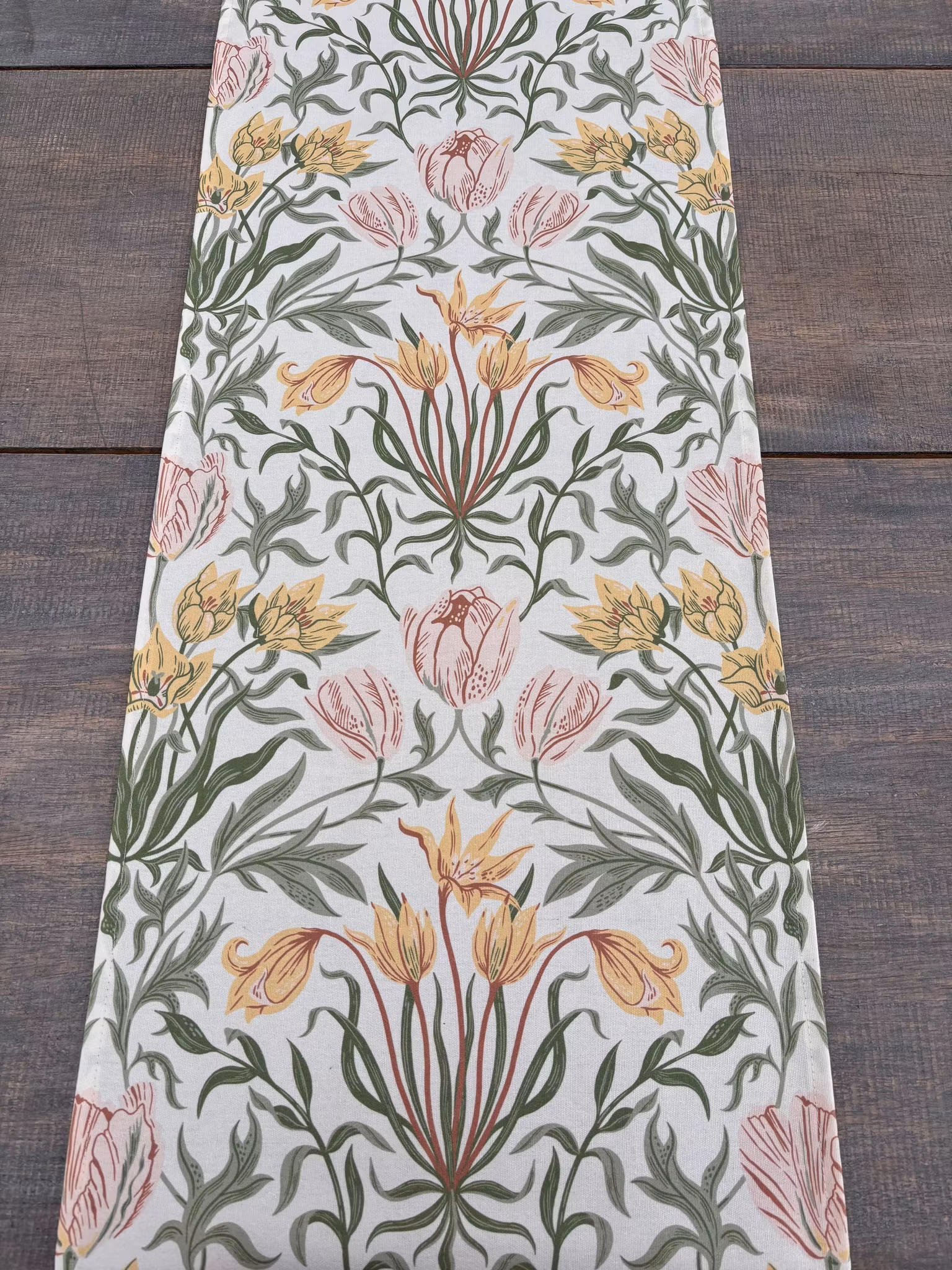 Ljuvlig löpare med blommor i rosa och gult med gröna blad mot en ljus bakgrund. Fin på mat- & soffbordet under vår- & sommarsäsongen.