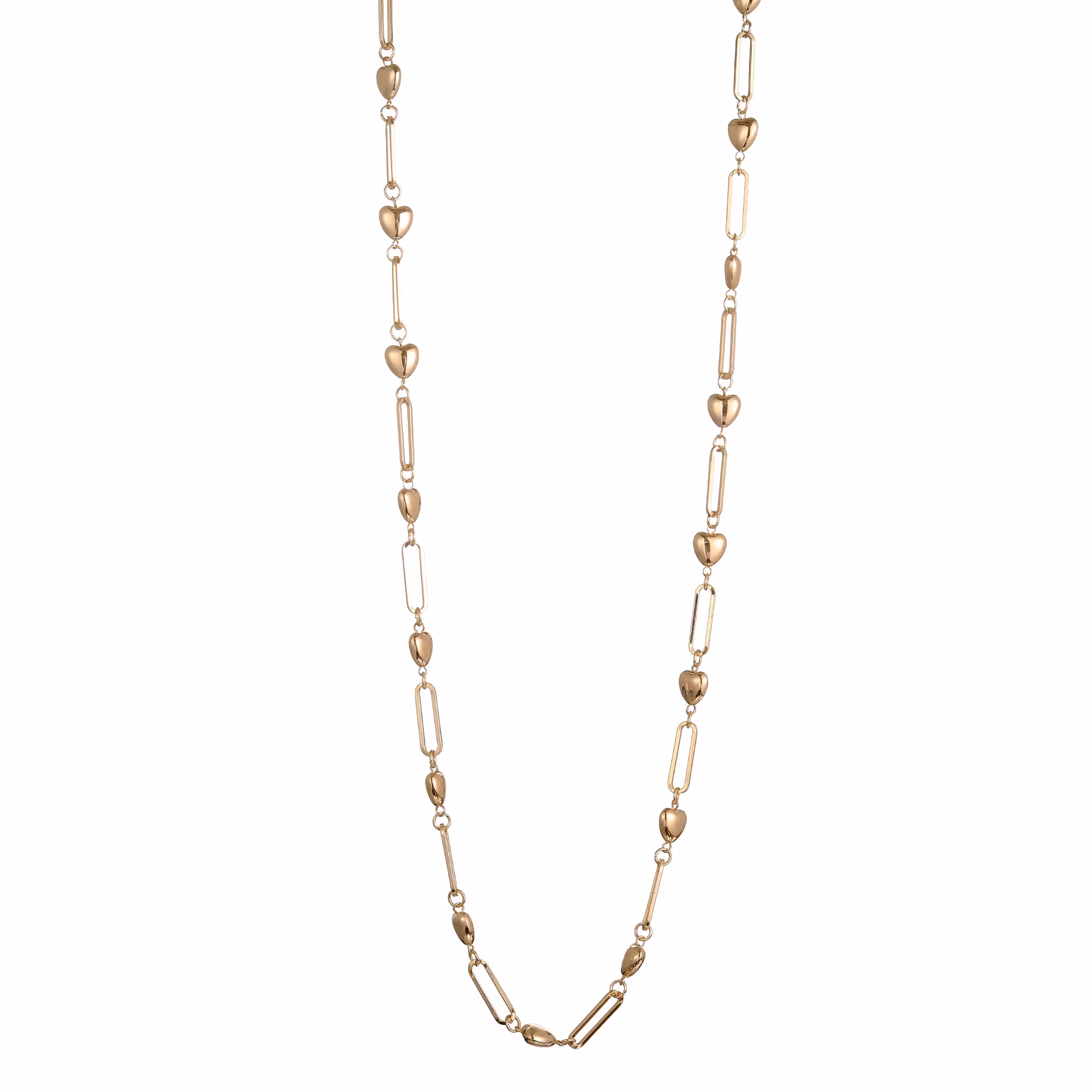 Ett stilfullt långt halsband med avlånga länkar som varvas med små hjärtformer längs hela kedjan. Den genomtänkta designen ger ett elegant flöde och ett personligt uttryck, perfekt för dig som vill bära något tidlöst med en feminin twist.