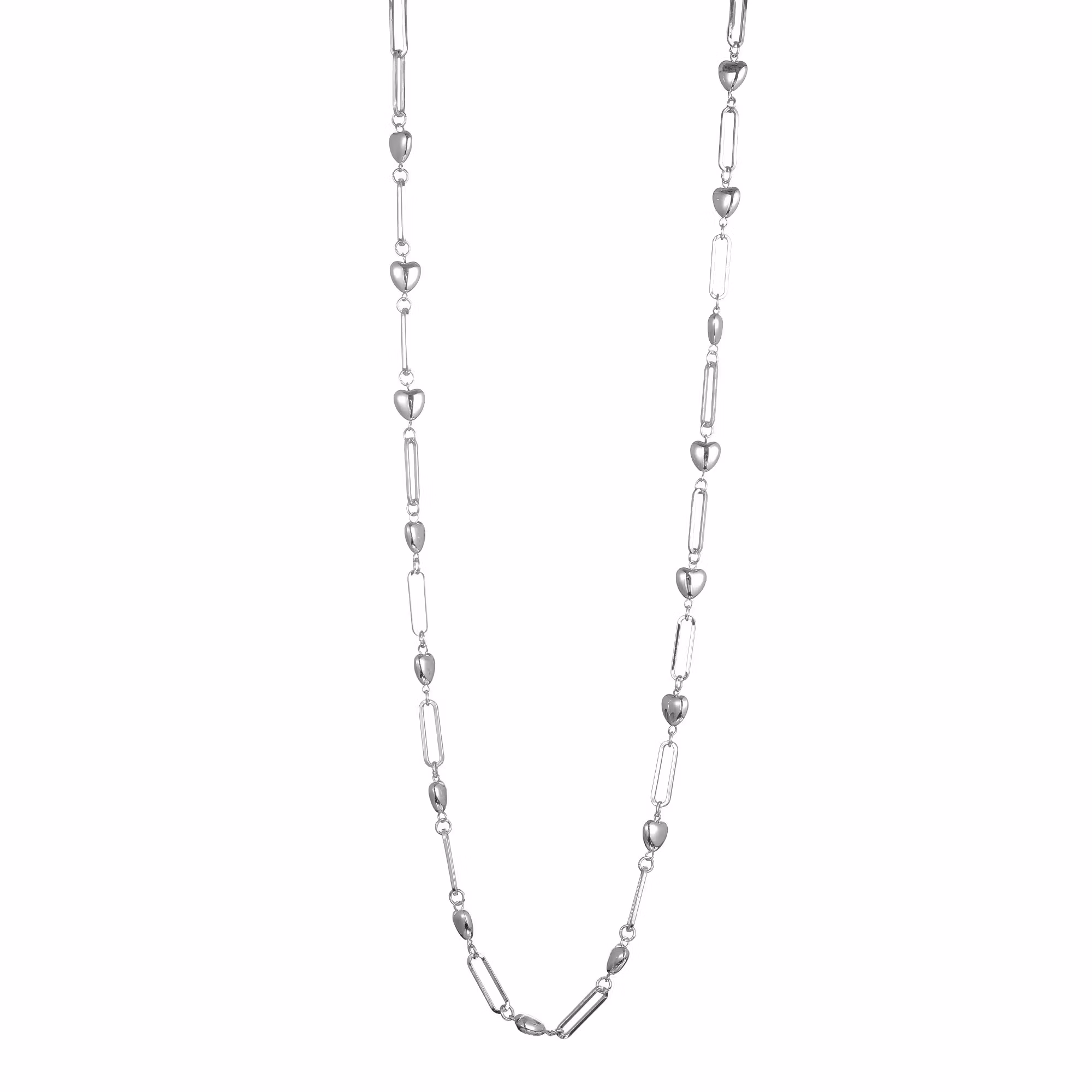 Ett stilfullt långt halsband med avlånga länkar som varvas med små hjärtformer längs hela kedjan. Den genomtänkta designen ger ett elegant flöde och ett personligt uttryck, perfekt för dig som vill bära något tidlöst med en feminin twist.