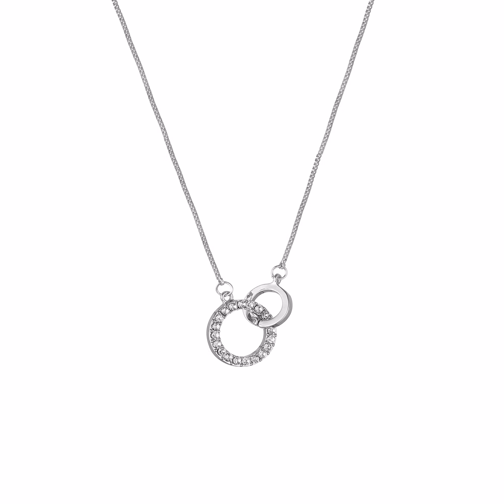 Stilrent kort halsband i legering och järn med två sammanlänkade ringar, varav en gnistrande med strasstenar. Ett elegant smycke som symboliserar samhörighet och lyfter varje look.