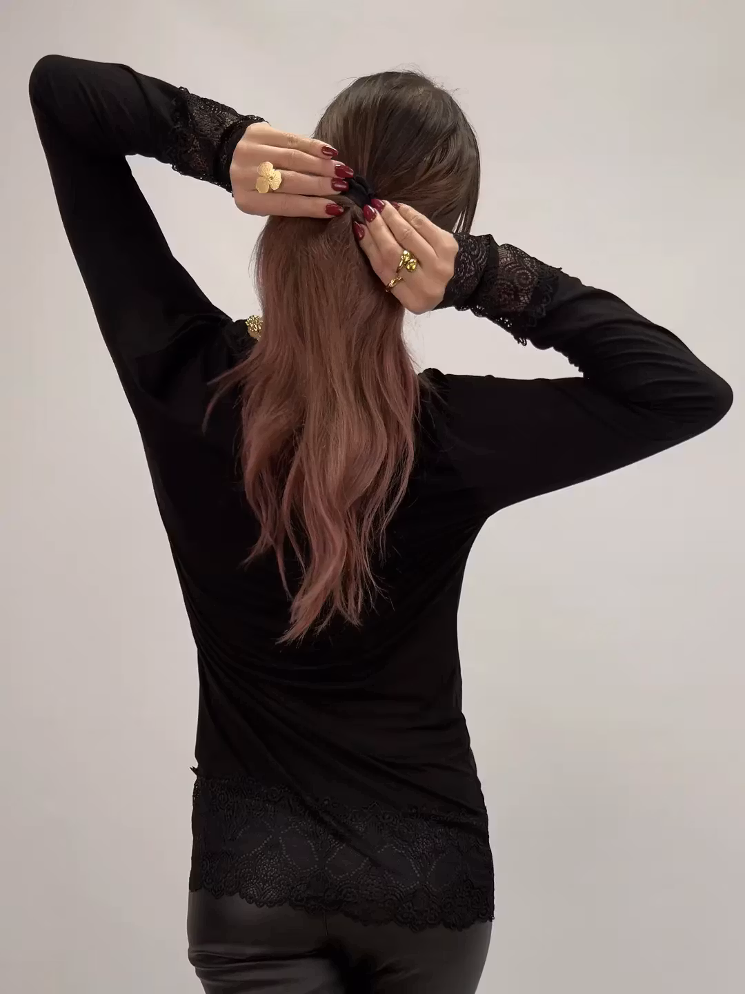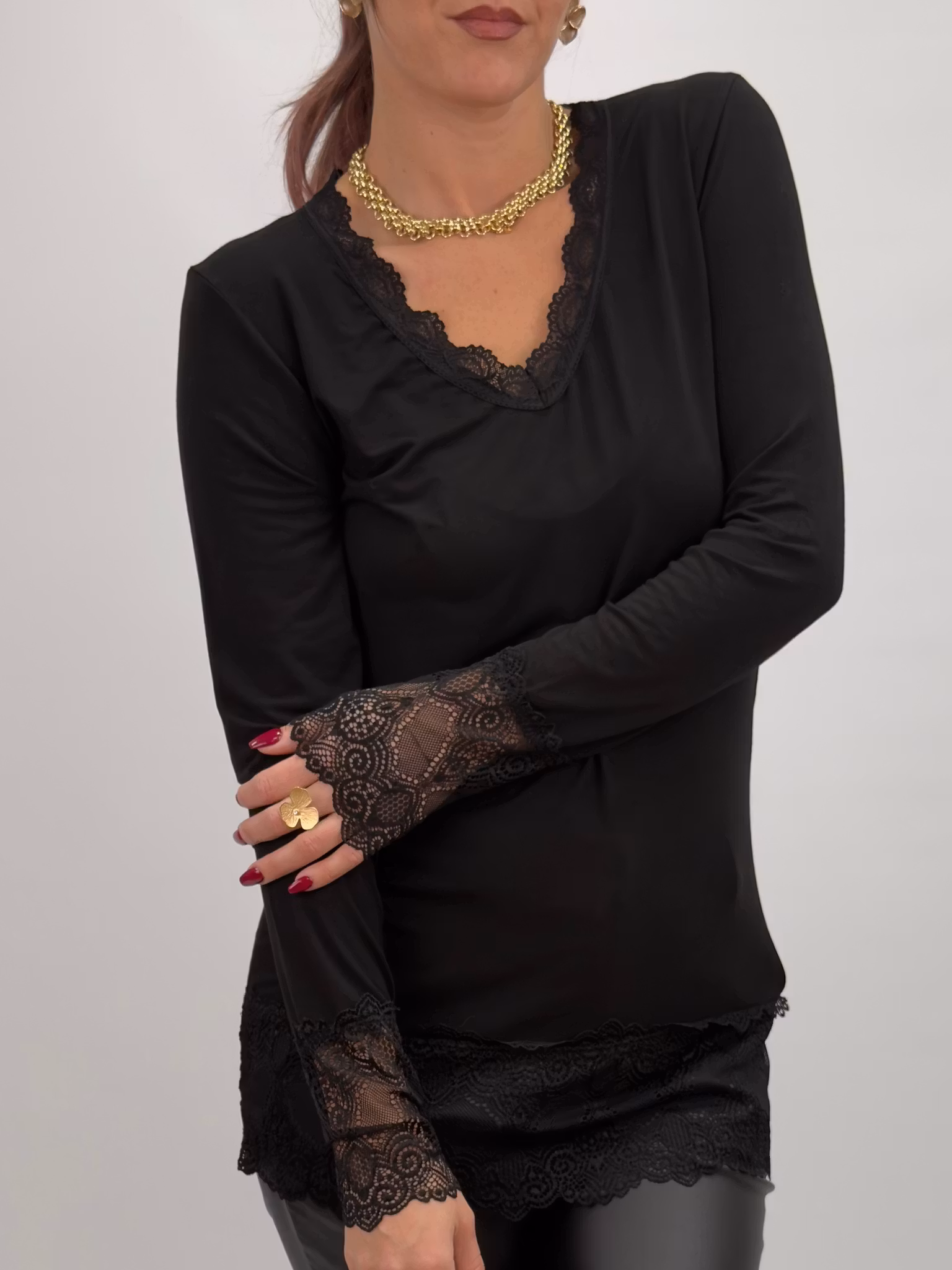 Lilian är en mjuk och feminin topp ja med v-ringning och vackra spetsdetaljer vid hals, ärmslut och fåll. En stilren modell med det lilla extra som funkar lika bra till byxor som till kjol – en klar favorit i garderoben. Passar lika bra till vardags som till fest och under ett annat plagg för att låta spetsärmarna skapa en stilfull detalj.