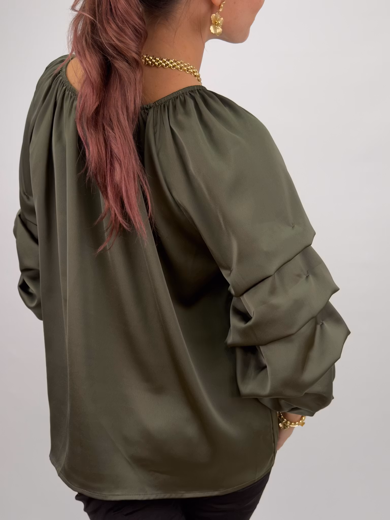 Raya är en glansig blus med vackra volymärmar som ger en sofistikerad men lekfull känsla. Perfekt för både vardag och fest, där den glänsande ytan lyfter din stil och gör varje outfit speciell.