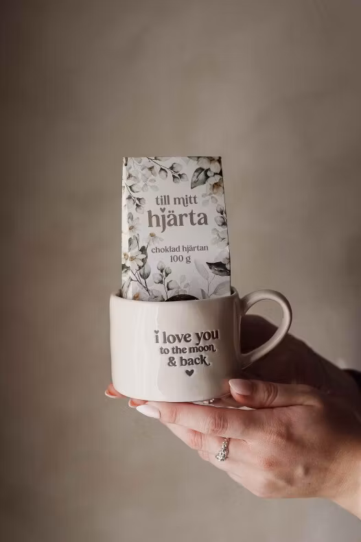 Ljuvlig mugg med organisk handgjord känsla och silkscreen text I love you to the moon & back. Muggen är gjord i stengods som tål micro och diskmaskin samt är foodsafe säkrad.