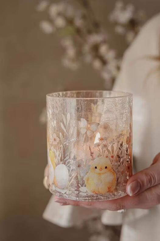 Finish: Handgjord krackelerad glaslykta med mönster av påskens söta kycklingar och blommor