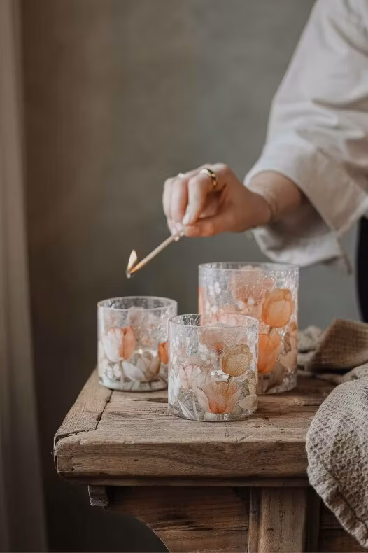 Finish: Handgjord krackelerad glaslykta med mönster av vackra Tulpaner.