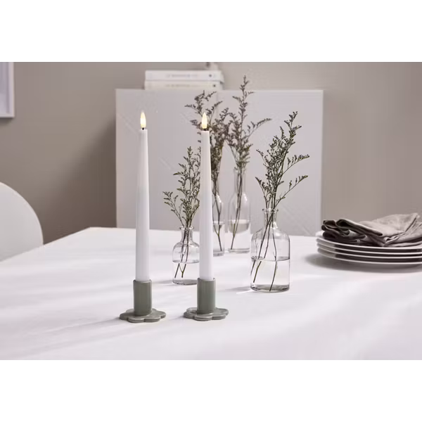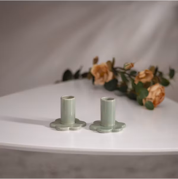 Bloom är ett 2-pack ljushållare för levande ljus eller batteriljus. Gjord av porslin i en mildgrön färg.