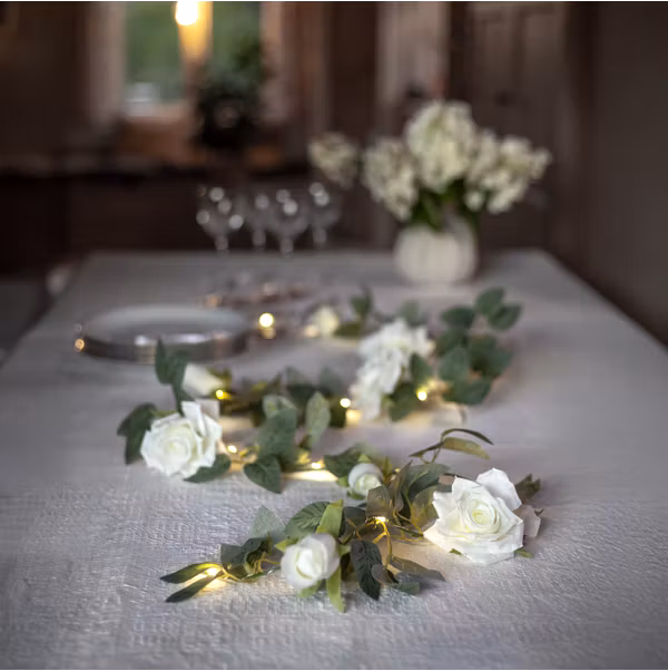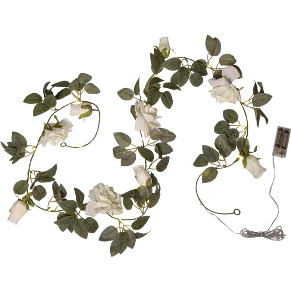 Dekorativ ljusslinga med konstgjorda rosor och blad i vit och grön färg för inomhusbruk. Tunn metallslinga med 20 varmvita ljuspunkter lindad runt blommorna. En vacker dekoration till hemmet, tex till bordsdukning.